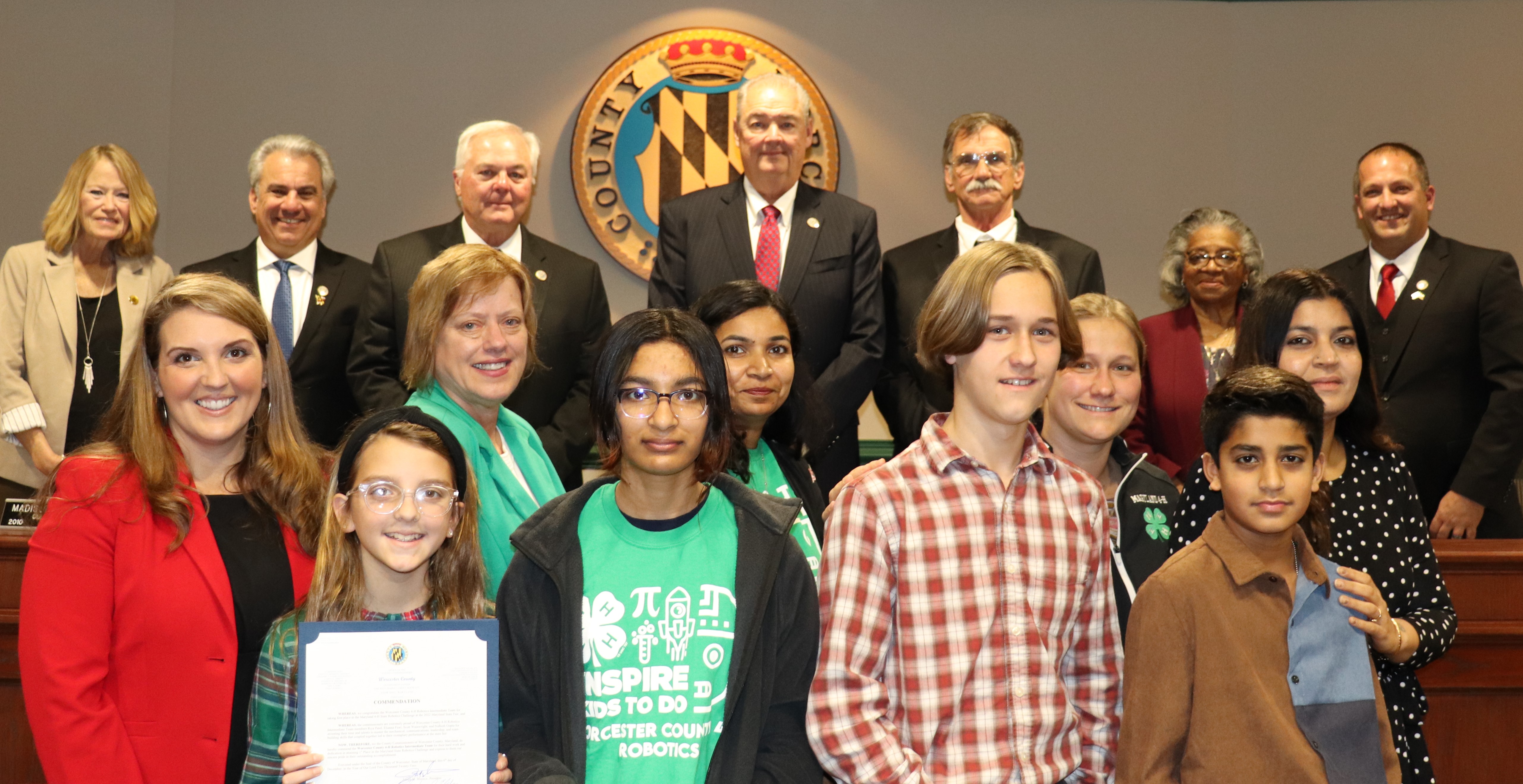 Snow Hill, Maryland (Dec. 6, 2022) - The commissioners present commendations to members of the Worcester County 4-H Robotics Intermediate Team for taking first place in the Maryland 4-H State Robotics Challenge at the 2022 Maryland State Fair. Congratulations go out these young people for their exemplary performance. Those pictured include Elianna Fiori (front row from left), Riya Patel, Scott Wainwright, and Nidhish Gupta; and team coache Mendy Fiori (second row, from left), Barbara Barga, of the Extension Office, and team coaches Gira Patel, Amanda Wainwright, and Shriya Gupta; and Commissioners Caryn Abbott (third row, from left), Chip Bertino, Jim Bunting, Joe Mitrecic, Ted Elder, Diana Purnell, and Eric Fiori.